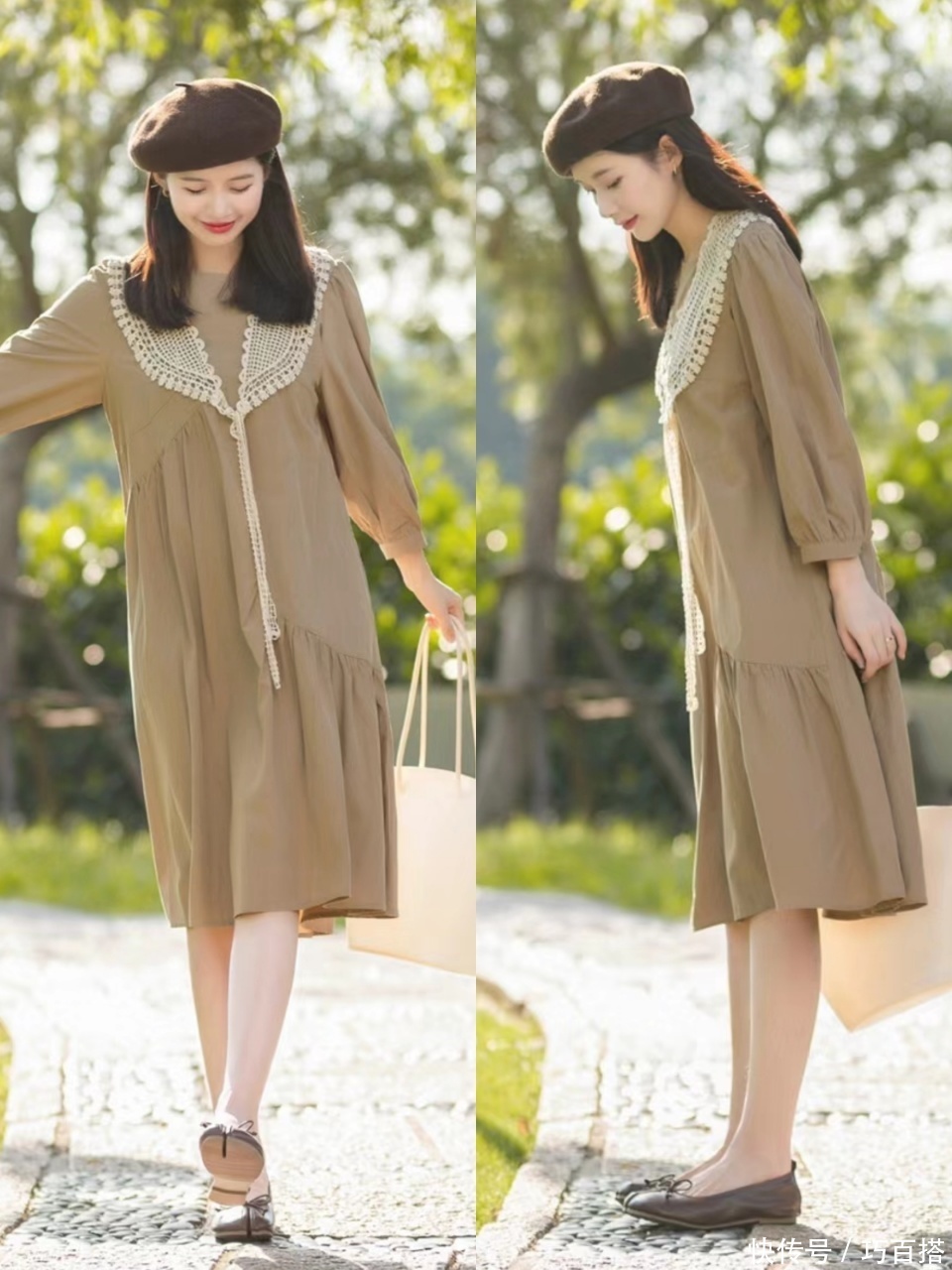 年青女孩在挑选早秋守旧连衣裙时,不错以淡色系为主,精雅脱俗又不外分条件体魄,好独霸还能穿出守旧长裙的精髓,像博主身上这类奶茶色便是标配。
